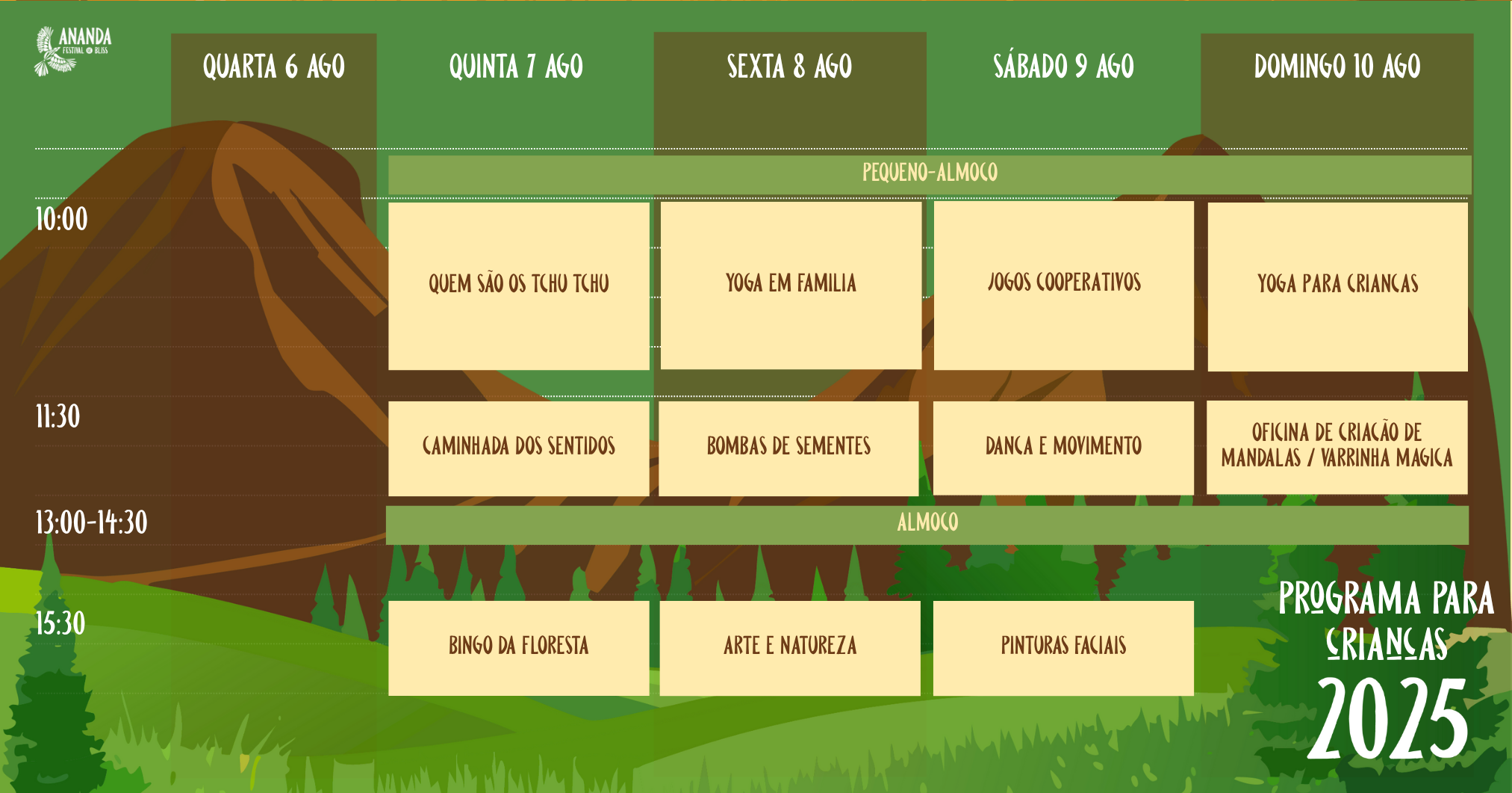 No Ananda Festival, criámos um espaço especial só para crianças e jovens se divertirem, explorarem e se conectarem. Desde música e dança até oficinas práticas, cada atividade foi pensada para inspirar alegria e curiosidade — e para ajudar cada um a descobrir formas simples de viver com mais gentileza em relação ao mundo à nossa volta. Explora abaixo os programas deste ano para Crianças e Jovens.